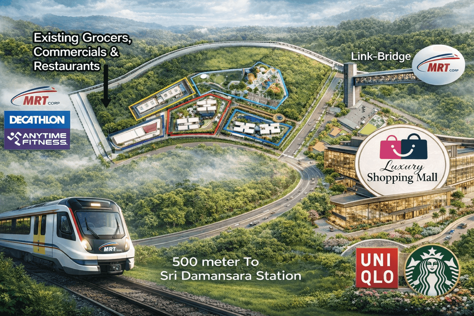 The development is strategically located near MRT stations, providing convenient connectivity to Kuala Lumpur, Petaling Jaya, and key employment hubs.